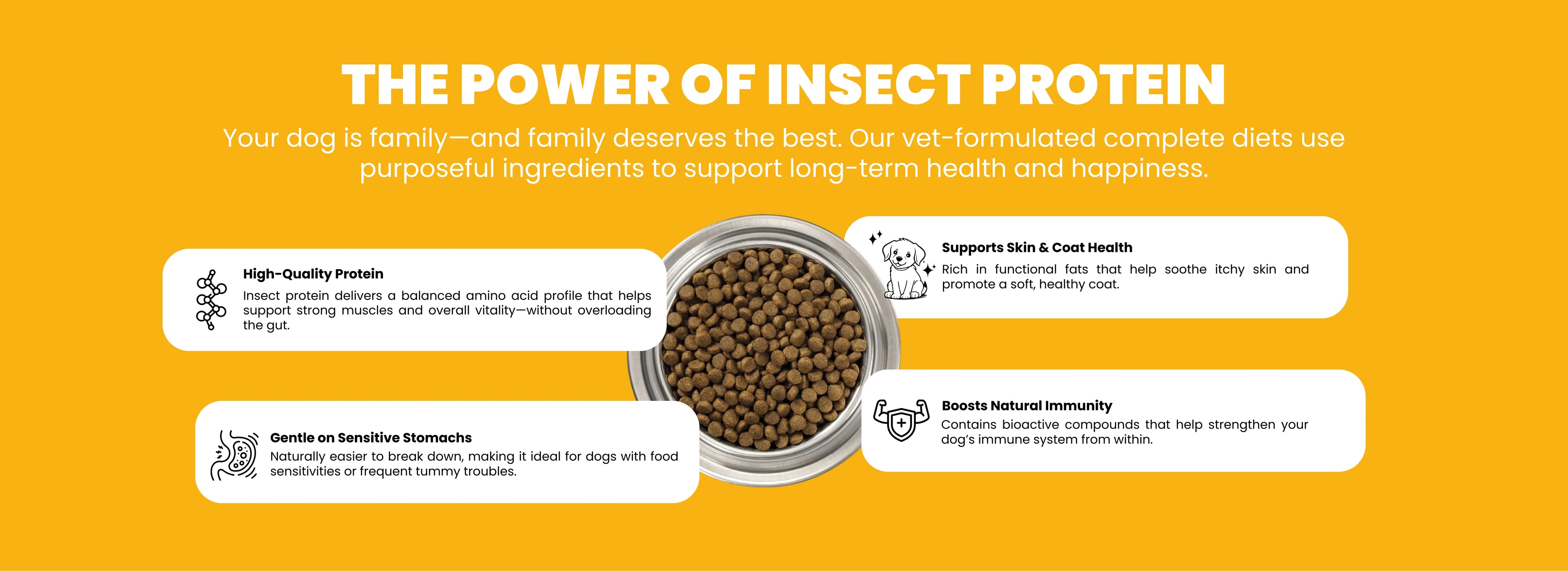 Consider insect-protein-based pet food for pets with allergies. Insect protein offers a novel, hypoallergenic alternative to traditional protein sources like chicken, lamb, or cattle meat. Packed with high-quality protein for strong muscles and bones, give your furry friend the itch relief and complete nutrition they deserve!