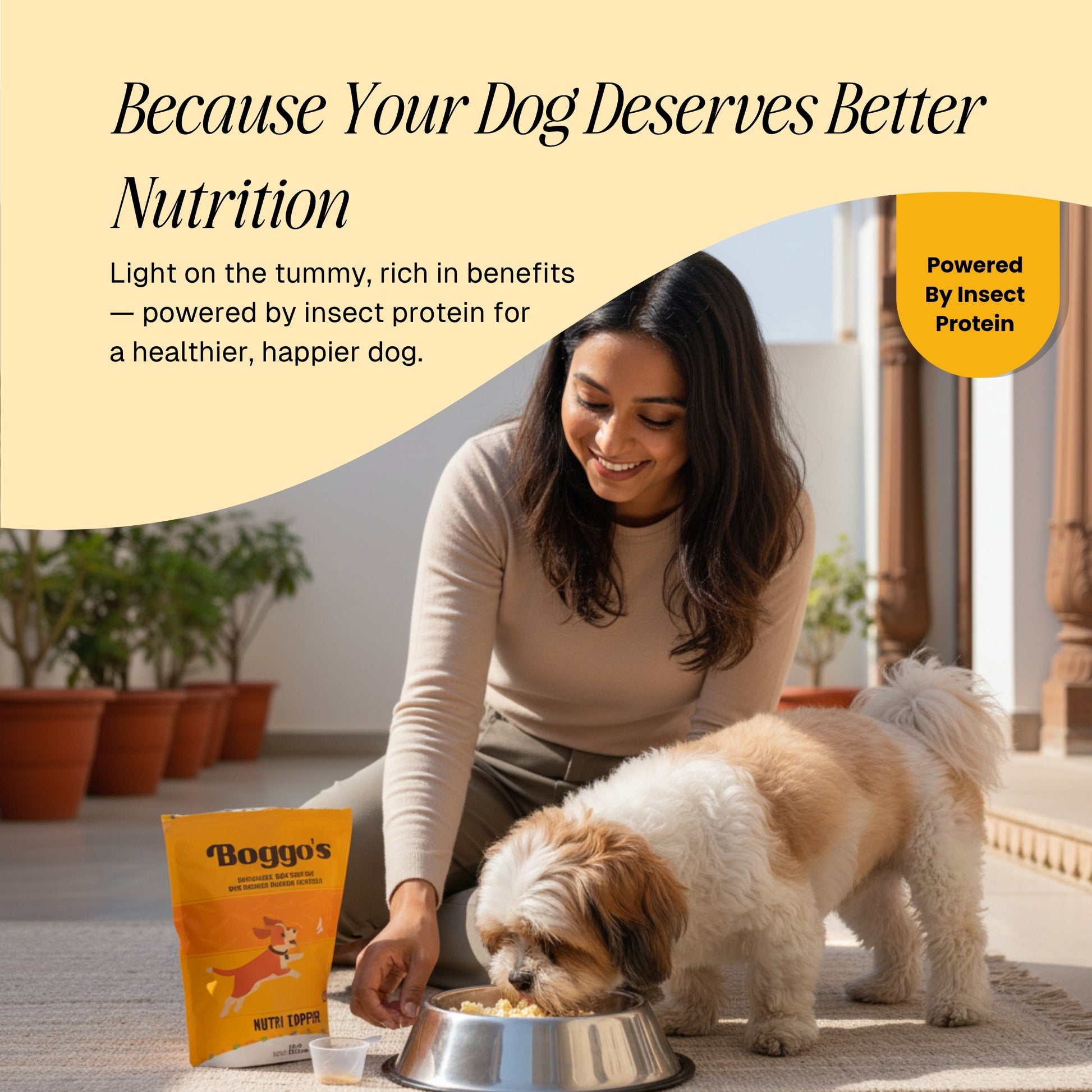 Best Dog Food For Indie Dogs, Boggo’s Nutri Topper is packed with vitamins, essential oils and insect protein to support everything, from immunity, joint health, and stomach to their glossy coat.